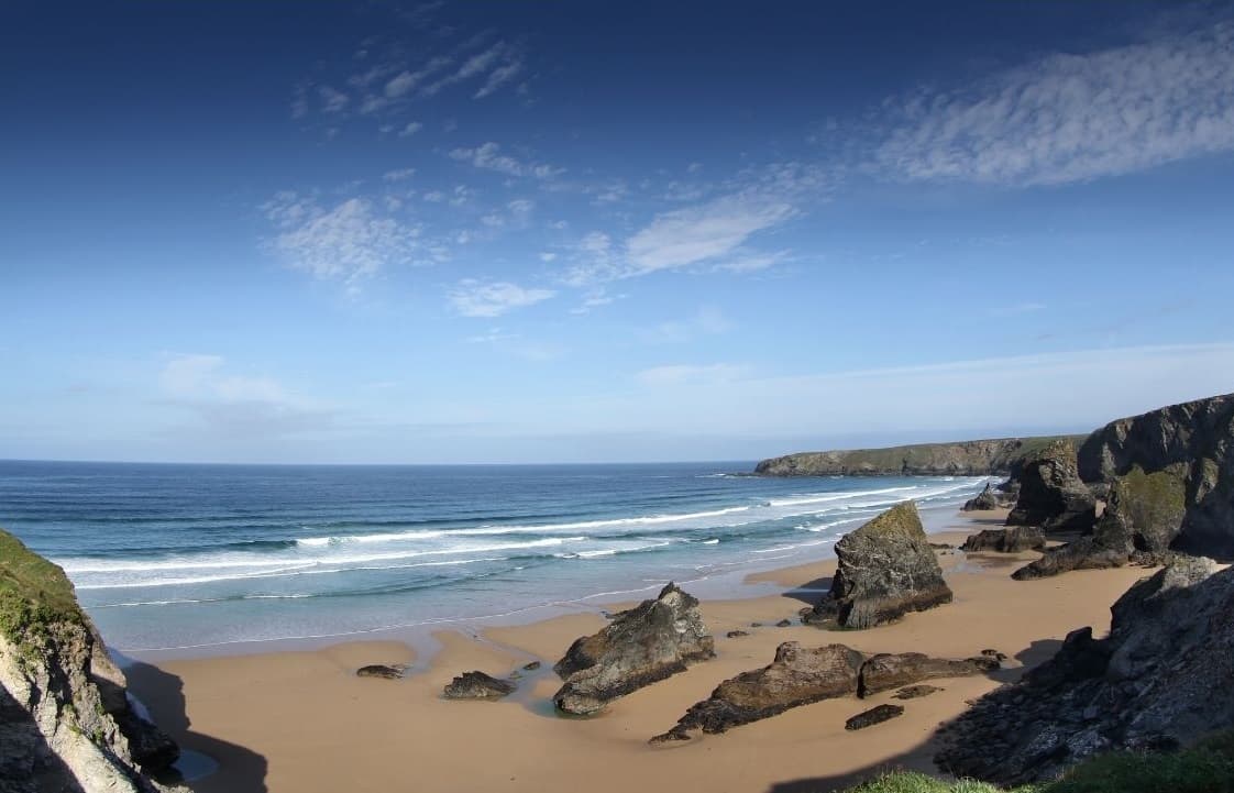 Carnewas and Bedruthan Steps is a beautiful area of dramatic cliffs and a large sandy beach. w rocks scattered along the shoreline. At low tide there is just over a mile of sand to explore.